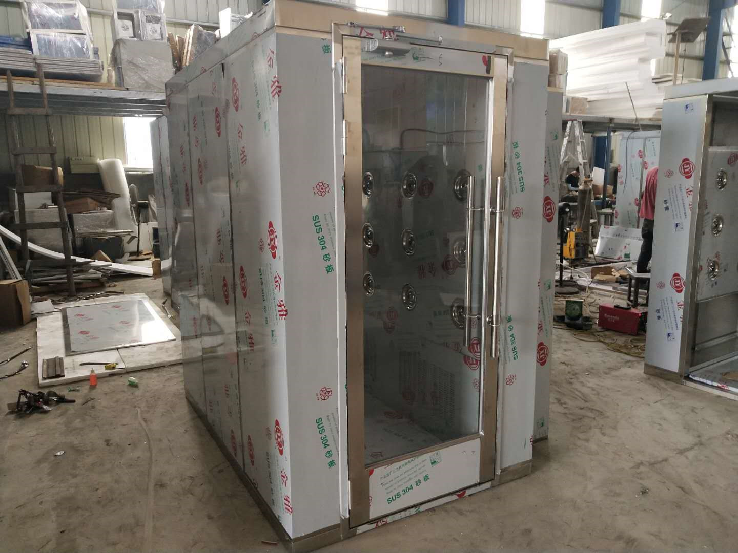 >>整體采用SUS304砂光不銹鋼/冷軋鋼板烤漆制作(國標1.0mm),配不銹鋼通道地板,配砂光不銹鋼半玻璃視窗門;